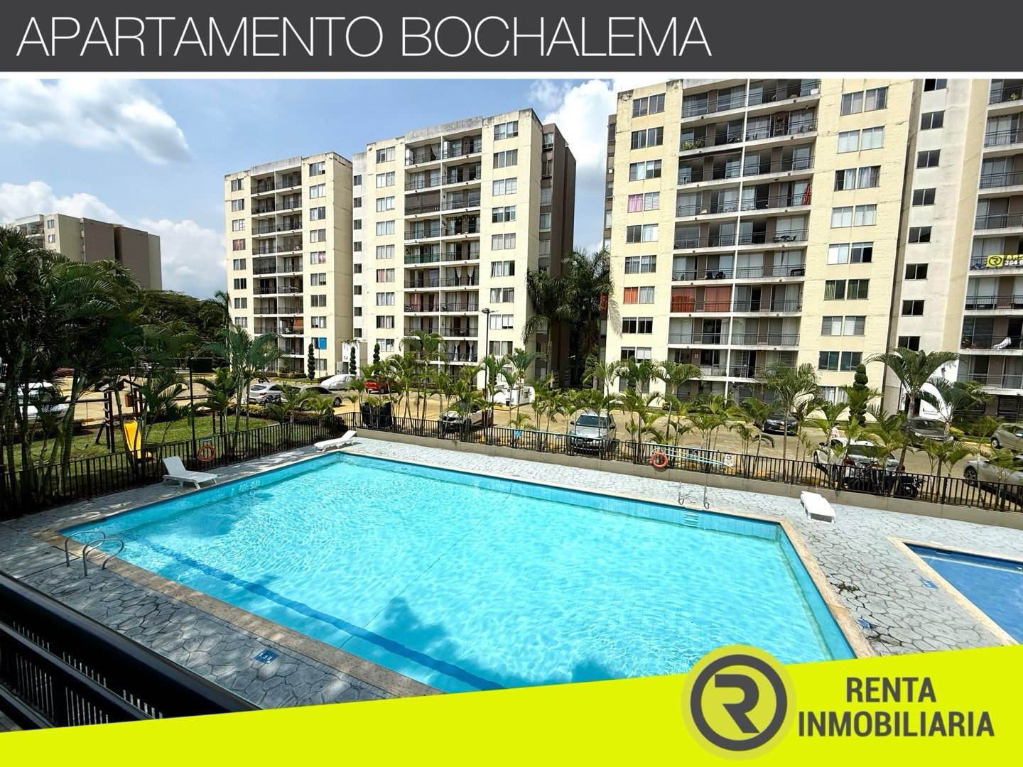 BOCHALEMA ALQUILER APARTAMENTO, 5 PISO, Con Ascensor, 63 m2, CONSTA DE: Sala Comedor, Balcon Amplio, Cocina Integral, Zona de Oficios, Baño De Alcobas, 3 Alcobas Con Closets, Principal con Baño, GARAJE PROPIO EN SOTANO, LA UNIDAD CUENTA CON: Amplias Zonas Verdes, Piscinas, Salones Sociales, Gym, Estadero, Juegos Infantiles, UBICACION Bajando el Puente Nuevo que Une con Valle del Lili - www.rentainmobiliaria.com.co